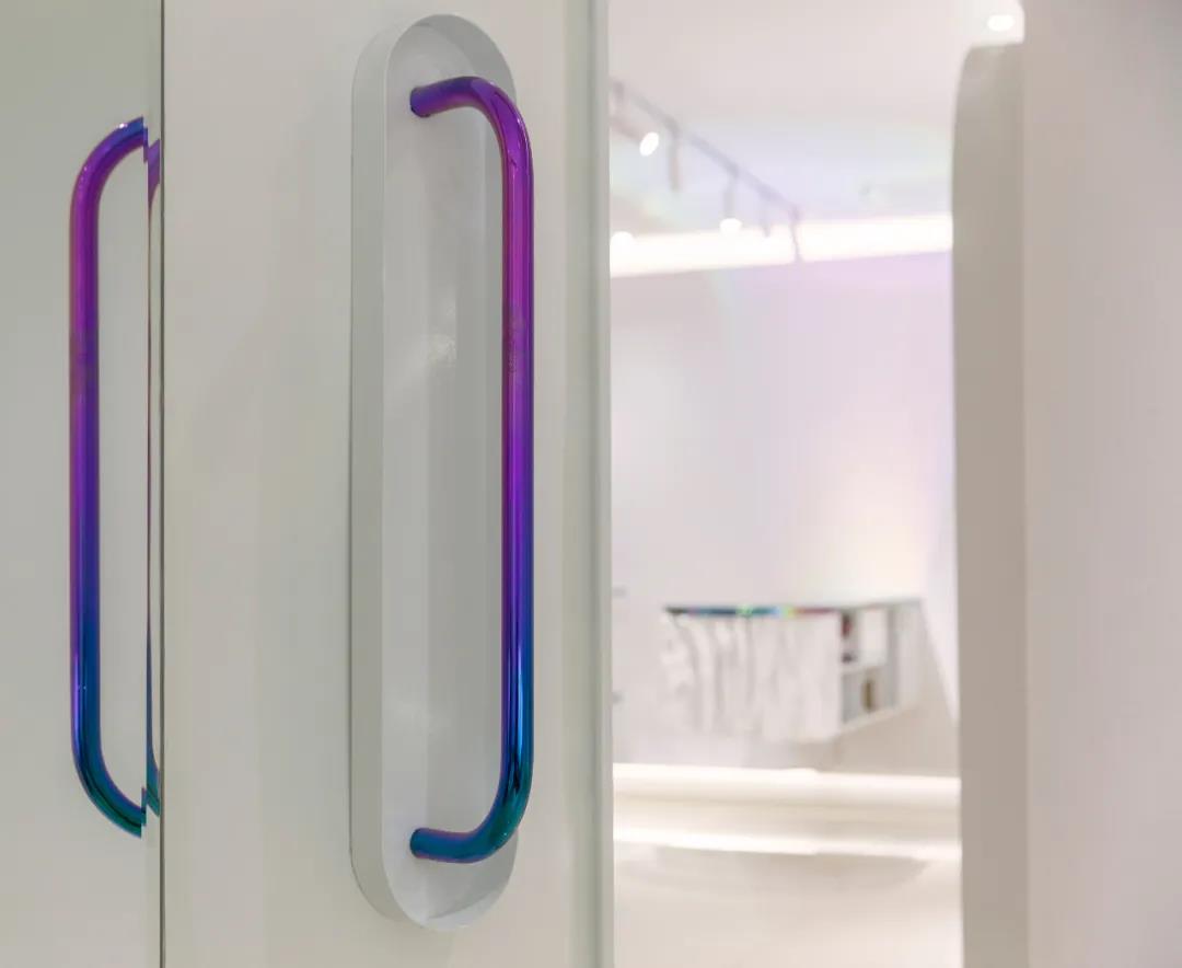Recovery專注于使用高科技光療法護理皮膚,我們主要以這項技術為出發點深化美容院的設計概念和美感。與之相對的是光滑的拋光墻面,將訪客的目光從入口處被吸引至光療室的私人空間。我們創作了許多模型來達到垂直褶皺層的效果,并采用了帆船制造中常見的特殊節點技術。精致的接待柜臺從墻上懸垂而出,輕盈而精巧。柔和、輕薄、半透明的門簾遮擋住內部的使用者,防止外面路過的人朝里面看。在光療室走廊盡頭的鏡子給人留下深刻的印象,同時也給人一種錯覺,即每個房間不是一個房間而是裝飾精美的隔墻,開門的時候垂直覆蓋層相互摩擦,沙沙作響,令人享受的噪音打破了往日的平靜,并且在打開這些大門的同時內心會產生一種儀式感。